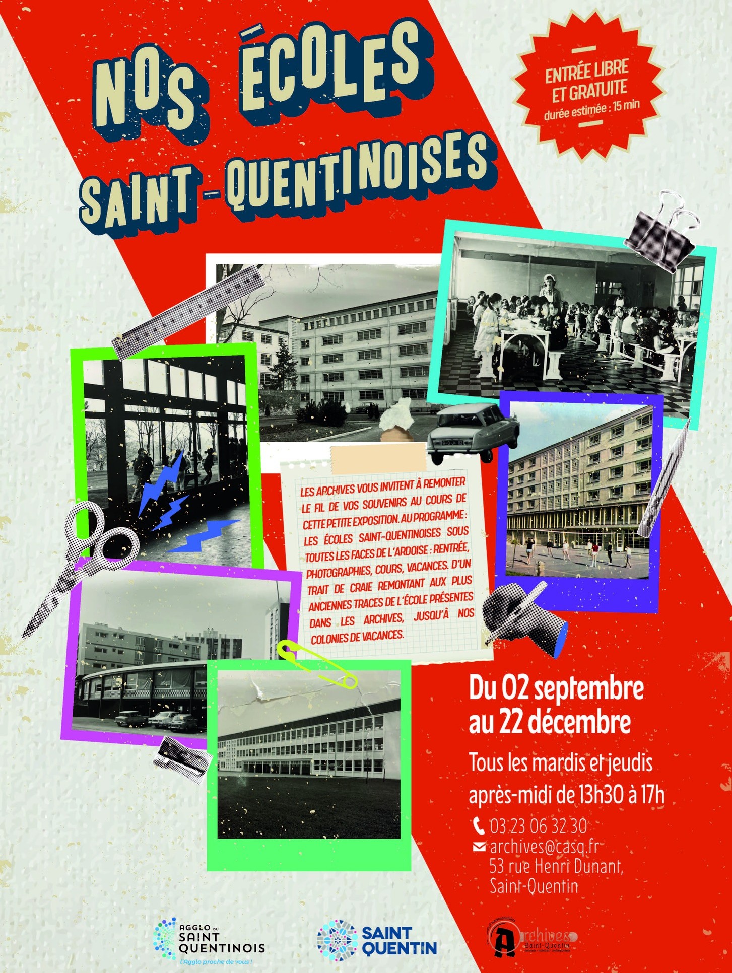 Au programme : les écoles saint-quentinoises sous toutes les faces de l’ardoise : rentrée, photographies, cours, vacances. d’un trait de craie remontant aux plus anciennes traces de l’école présentes dans les archives, jusqu’à nos colonies de vacances.