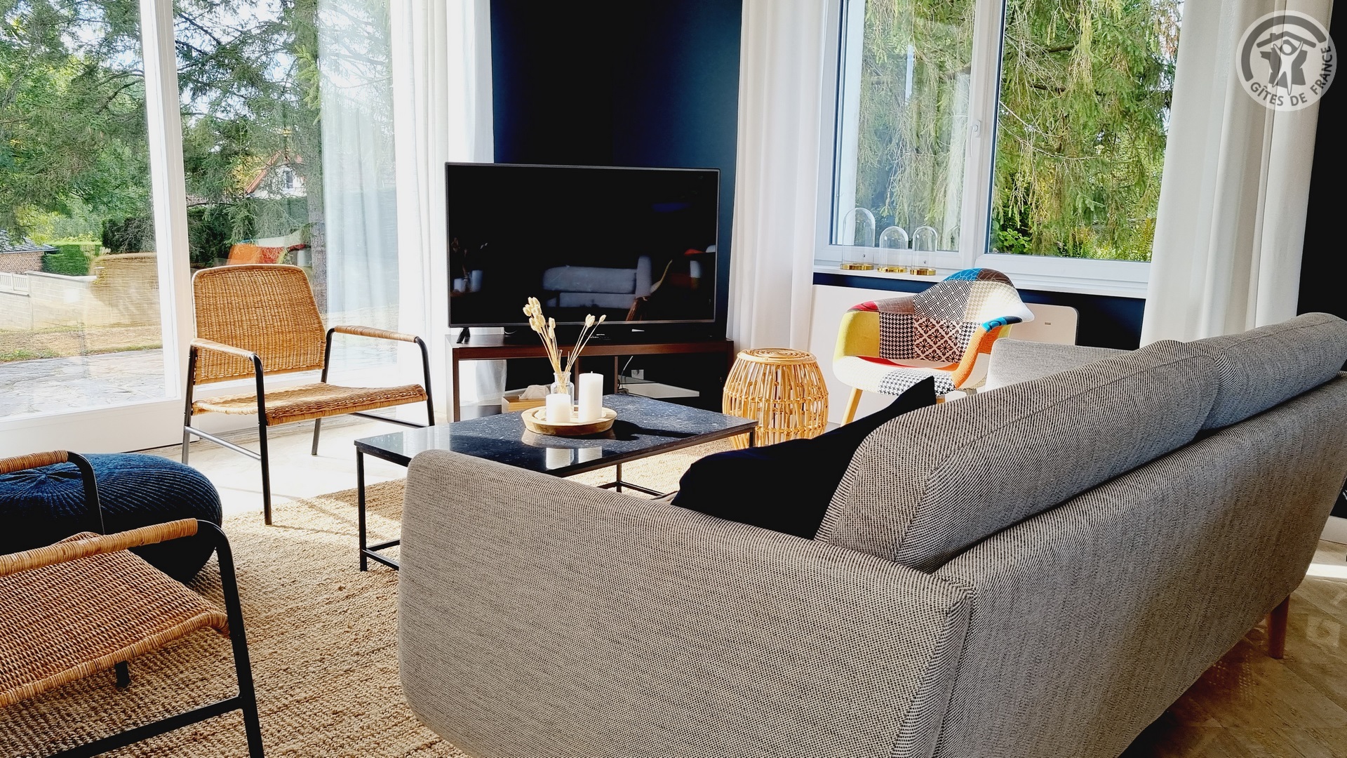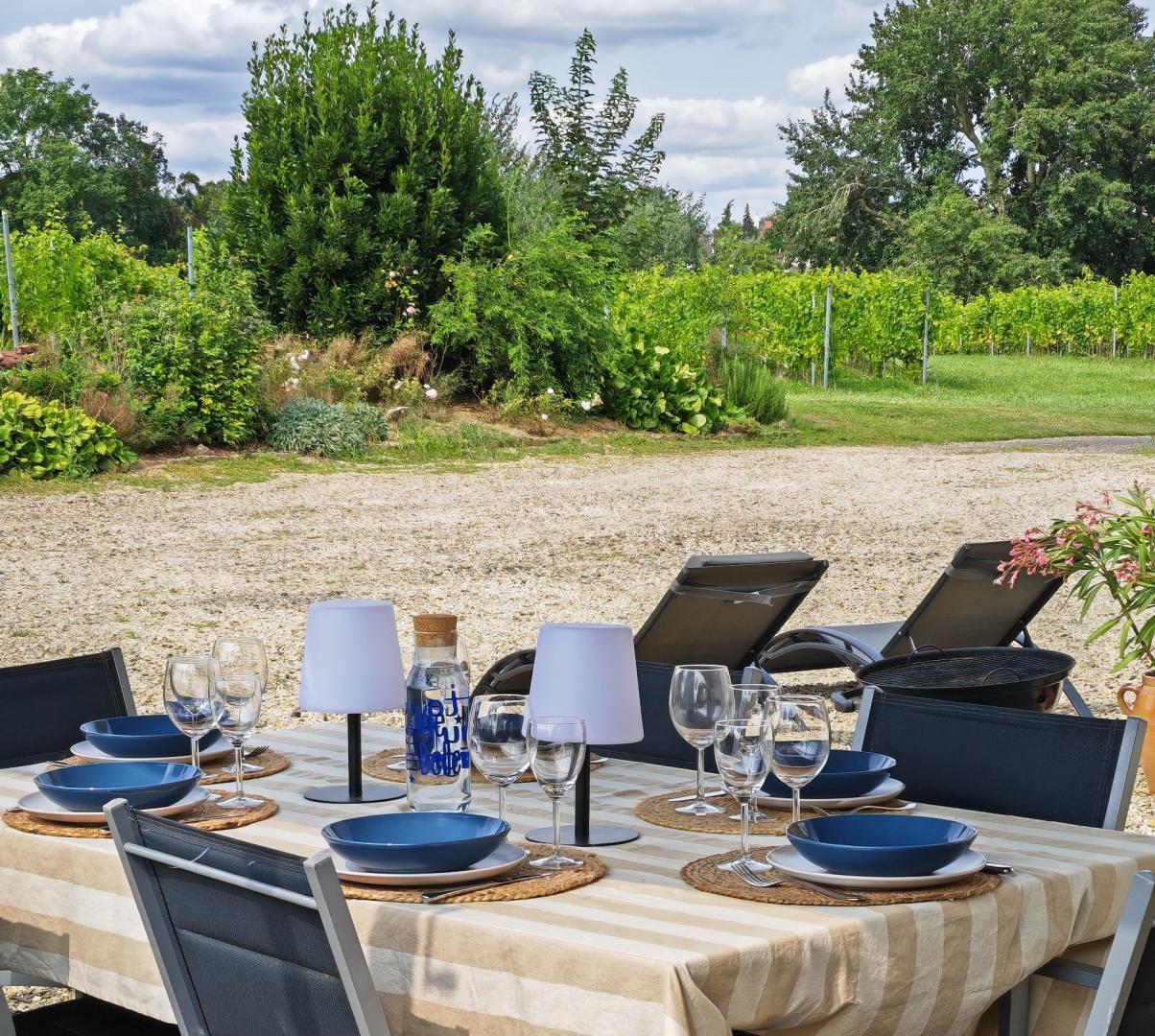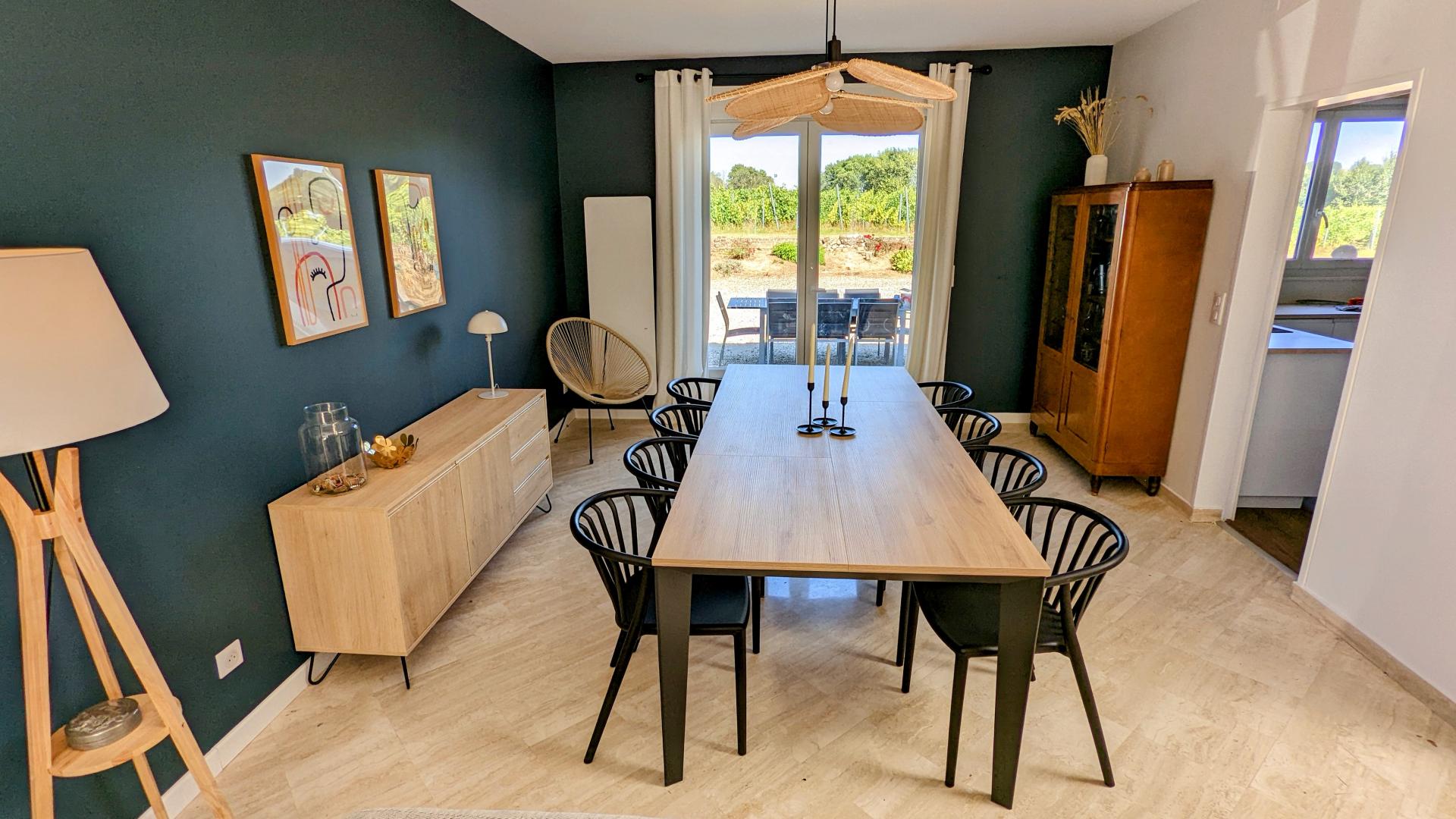 Maison indépendante de plain-pied (125 m²) des années 70, au centre du village, avec vue privilégiée sur les vignes. Quelques marches pour accéder à l'entrée à l'avant mais accessible à l'arrière sans marches, côté parking. Terrasse 74 m². Jardin non clos 2000 m². Prise Green'up pour la recharge des voitures électriques (coût de recharge non compris dans le prix de location). Cuisine équipée. Salon/salle à manger de 58 m² avec TV (139 cm) connectée. Salle d'eau avec douche italienne (150x90) et 2 vasques. WC indépendant avec lave-mains. Chambre 1 : 1 lit 140x200, Chambre 2 : 1 lit 160x200. Chambre 3 : 1 lit 160x200. Salle d'eau : douche italienne (140x80) et vasque. Sous-sol : garage 1 voiture, espace jeux : baby-foot, table de ping-pong, jeu de fléchettes électronique. Espace de remise en forme : 1 vélo d'appartement, 1 vélo elliptique et 1 tapis de course. Cheminée à foyer ouvert (uniquement avec des bûches densifiées, 6 bûches fournies à l'arrivée, au-delà payant).