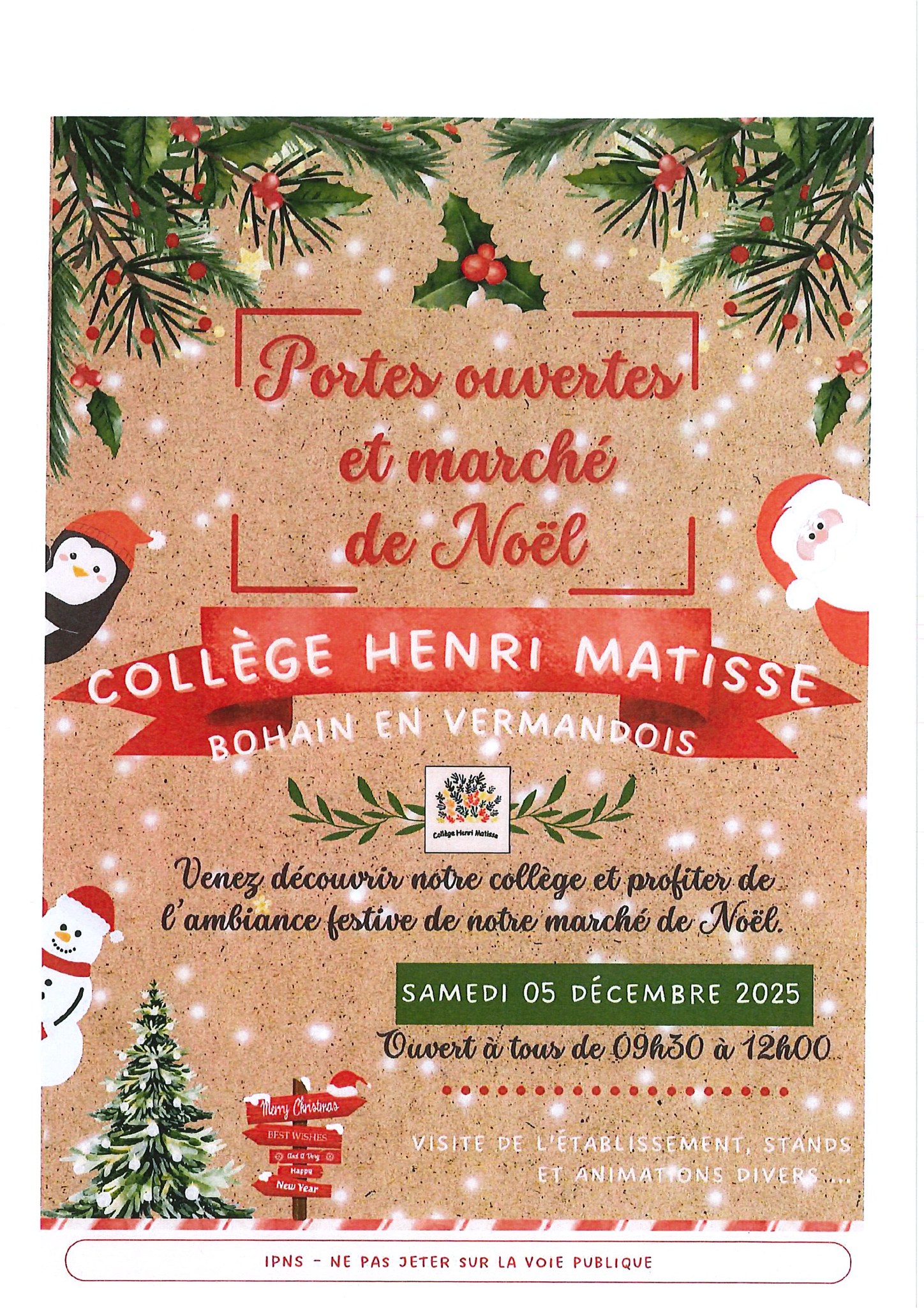 Venez découvrir le collège Matisse à Bohain en Vermandois le 5 décembre de 9h30 à 12h et profiter de l'ambiance festive de son marché de Noël.